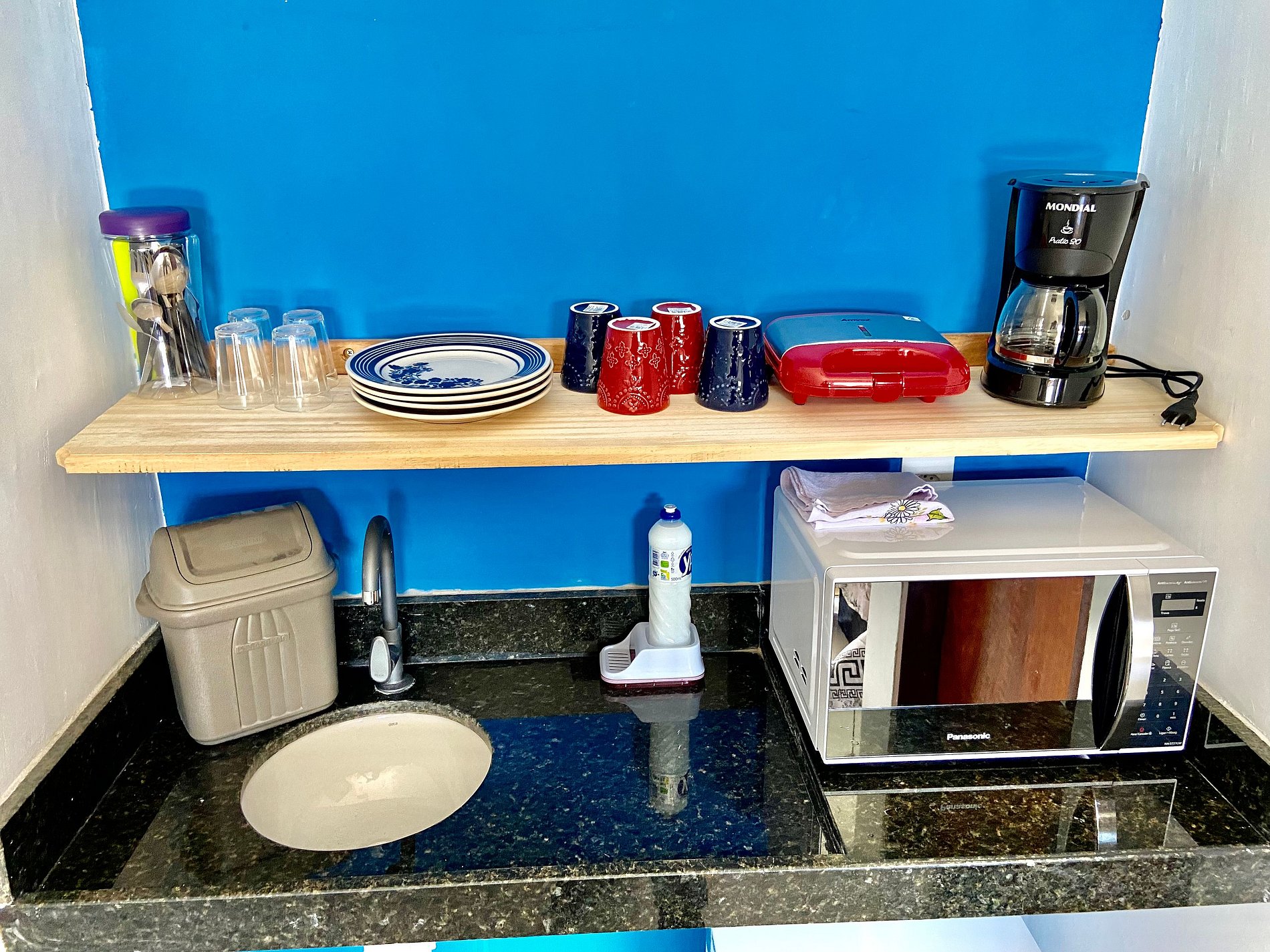 Cada suíte oferece ar-condicionado, varanda, internet, TV Smart, banheiro com box, frigobar, micro-ondas, lancheira, cafeteira, utensílios, camas, mesa e cadeiras. Além de piscina, vaga de carro individual para cada suíte e uma cozinha compartilhada para todos os hóspedes.